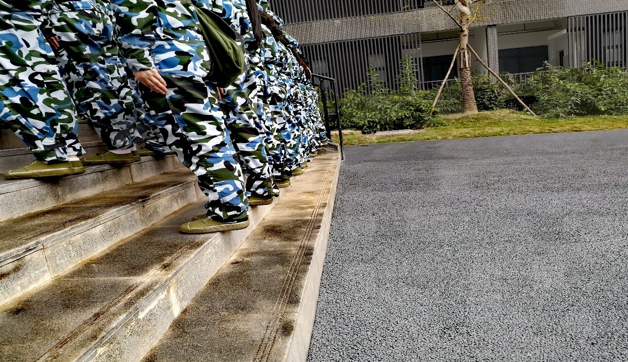 为了让我们的军姿更标准,更有气势,教官因地制宜,利用台阶来辅助训练,大家全脚掌的三分之二悬在台阶外,为了保持平衡就自然的全身绷紧并微微前倾,一个标准的军姿就这样形成了,虽然过程有一点痛苦,但是看到自己的军姿变得挺拔有气质时,大家都对教官的“老辣”心服口服!