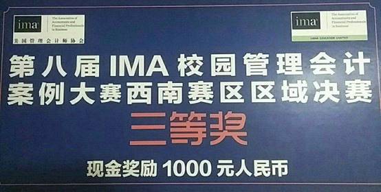 2018年4月22日,由美国管理会计师协会(IMA)组织的第八届IMA校园管理会计案例大赛西南赛区区域决赛于四川大学商学院顺利举行,我校学子况真桢、张婷婷、巫晓菲、周昱如、杜宇瀚组成的Ferrari队与5支分别来自四川大学、西南财经大学、云南师范大学队伍同台竞技,经过一番激烈角逐,我校队伍一展雄风,荣获三等奖。