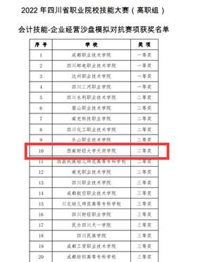 11月12日,由四川省教育厅主办的2022年四川省大学生职业院校大赛圆满落幕。本次比赛包括会计技能、银行业务综合技能、智能财税技能三个赛项。新葡萄8883官网AMG组织学生参加了会计技能赛项,其中包括财务会计和管理会计分赛项和沙盘模拟分赛项。最终由新葡萄8883官网AMG周鑫宇、张晓华老师指导的学生匡金平,袁茂婷,朱林,张富林在大赛中获得高职组四川省二等奖。