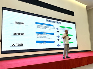 讲座伊始,饶洁阐述了事务所员工从新人到从业者、再到专业人员,最终成为“无助的前辈”的完整职业轨迹。饶洁结合自己多年的工作经历,以生动的语言和实务案例,让同学们深刻感受到每个阶段的成长与蜕变。他提到,每一阶段都伴随着不同的机遇与挑战,而正是这些经历塑造了员工们独特的职业品质和能力。随后,饶洁围绕职业能力进阶发展进行深入剖析。他强调,无论进入哪个行业,同学们都需要不断完善自身的职业能力。他建议同学们要按照入门级、职业级到匠师级的阶梯,逐步积累知识和经验,稳步提升专业素养。每个阶段的知识和技能要求均不同,需要脚踏实地,一步一个脚印地前行。最后,饶洁分享了他对职业生涯的修炼途径的独到见解。他鼓励同学们坚信“条条大路通罗马”的真理,相信每一分努力都不会白费。他强调“读万卷书行万里路”的修炼理念,即在量的积累中实现素养的提升,逐步达到知行合一的境界,从而把对所在行业的热爱转化成自身的内在动力,驱动自己在职业生涯中不断前行。