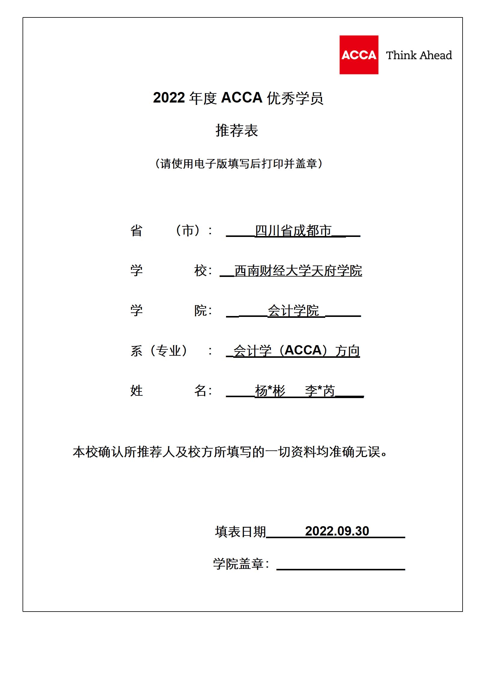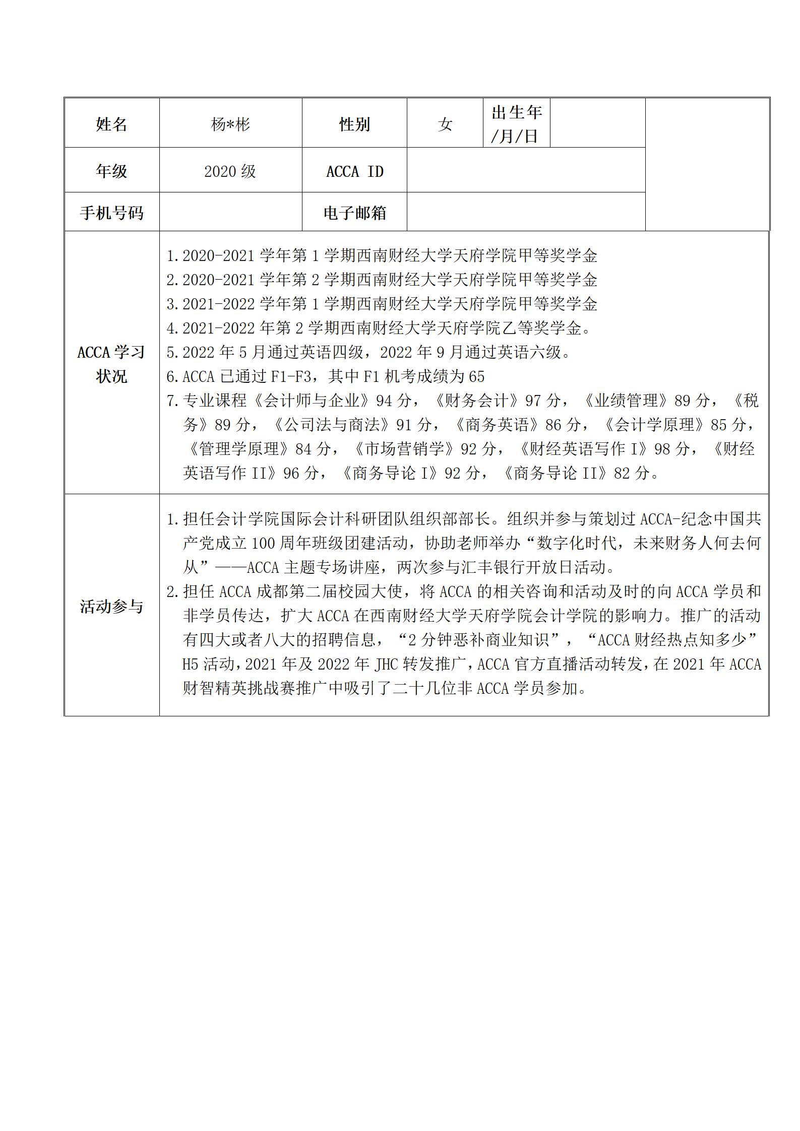 附件1:2022年度ACCA优秀学员推荐表--杨*彬