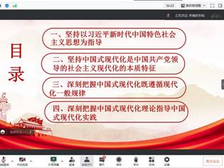 中国式现代化是中国共产党和中国人民长期实践探索的成果,是一项伟大而艰巨的事业。为深入学习贯彻中国共产党第二十次全国代表大会会议精神,不断拓展和深化对中国式现代化理论的认识,3月23日中午,新葡萄8883官网AMG第四、七党支部线上开展主题为“深化对中国式现代化理论的认识”的3月党课学习。本次党课由第四党支部副书记宋雪娇主讲,第四、七党支部全体党员参加。