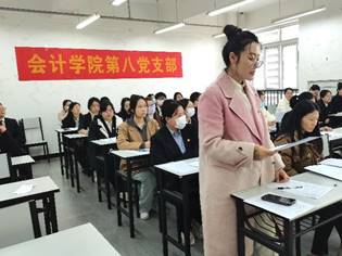本次支部大会涉及5个支部,分别在5间教室进行,党员代表姚玲燕、牟曼宁、杨惠丽、贾鸿丹、汪斯佳主持各支部的党员大会。会议伊始,主持人强调大会纪律后全体起立奏唱国际歌。大会第二项讨论各党支部发展对象入党问题和预备党员转正问题,各党支部发展对象和预备党员依次上台汇报个人情况后,对其是否能更进一步发展,各支部培养考察人及与会党员进行了现场表态,并最后由全体有投票表决权的党员进行投票表决。大会第三项,各支部党支部书记公布各发展对象和预备党员的投票结果,并带领大家进行入党宣誓。会议最后,党支部书记总结到,全体党员同志要坚定理想信念,牢记入党初心,不断增强责任意识和担当意识,工作中坚持奉行“服务第一,人民至上”的宗旨,树立以人为本的意识,主动担当、敢于挑战、追求进步。