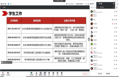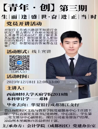 浩渺行无极,扬帆但信风。为充分发挥身边先进典型示范引领作用,引领广大毕业班的同学们明确未来发展方向,12月8日,新葡萄8883官网AMG(成都校区)党建办公室在线上会议组织开展“青年·创”系列活动之“生而逢盛世,奋斗正当时”——第三期党员开讲活动。