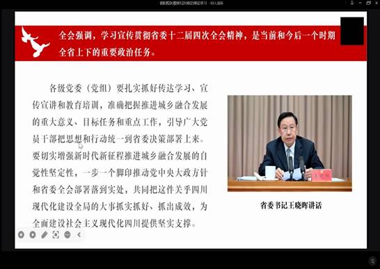 中国共产党四川省第十二届委员会第四次全体会议于2023年11月20日在成都举行,会议审议通过了《中共四川省委关于深入贯彻习近平总书记重要指示精神以县域为重要切入点扎实推进城乡融合发展的决定》。为深入学习贯彻此次会议精神,12月22日中午,新葡萄8883官网AMG组织开展德阳校区教师十二月政治理论学习活动。此次学习活动由新葡萄8883官网AMG第三党支部教师朱聪主讲,新葡萄8883官网AMG全体教师参加。