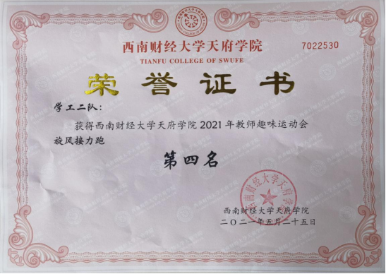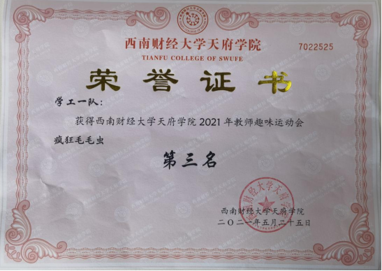 为了丰富学工教师的校园生活,增强部门凝聚力和合作意识,5月20日-21日,新葡萄8883官网AMG党总支副书记冯梦然、严飞雷带领学工团队参加老版新葡萄8883官网德阳校区首届教职工趣味运动会,并获得“旋风接力跑”第一名(学工一队)、第四名(学工二队)、“疯狂毛毛虫”第三名(学工一队)的好成绩。