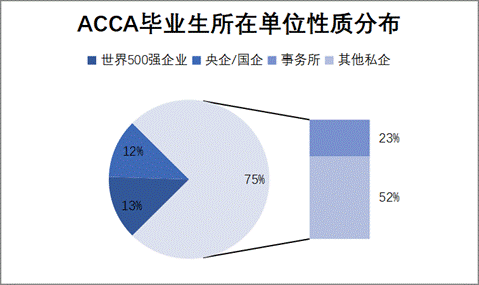从图中可以看出,ACCA专业毕业生所在的单位主要为事务所和私企,同时还有相当一部分毕业生在央企、国企和以及世界500强企业工作,也反映出了学校对国际班学生自主学习能力的提升和对学生综合知识的培养。