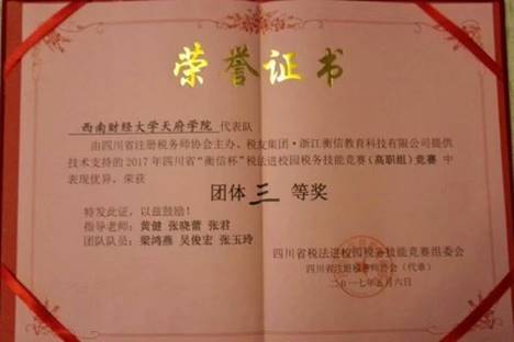 • 我院学子荣获2017年四川省“衡信杯”税法进校园税务技能大赛三等奖