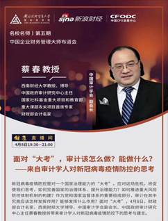 全球疫情不断升温,金融动荡加剧,全球经济面临着前所未有的下行风险。新冠病毒疫情防控是对一个国家治理能力的“大考”。4月8日,财政部会计名家、西南财经大学博士生导师、中国审计学会副会长、中国政府审计研究中心主任蔡春教授就“在危机中如何完善国家治理体系、提升治理能力?如何推进重大风险防控体制机制的构建?作为党和国家监督体系的重要组...
