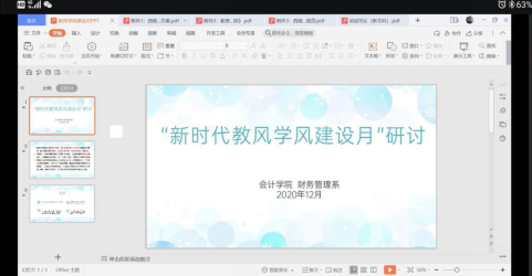 2020年12月10日,财务管理系全体教师在线上召开了“新时代教风学风建设月”活动主题学习研讨会议,会议由财务管理系副主任韩之璐老师主持。会议截图?会上,韩之璐带领大家集中学习了本次活动的主题,并号召各课程组将主题讨论融入本月课程组会议中,研讨如何将优良教风在课程中落地生根。接着,全体老师学习了《新时代高校教师职业行为十大准则》《西...